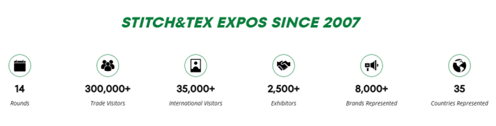 STICH & TEX自2007年创办以来,作为中东非地区纺织印花行业首要系列展会品牌,每年在埃及、摩洛哥、沙特、南非等地举行。展会规模逐年扩大,共吸引超过35000名中东非观众,300多家来自35个国家的展商,以及2000个企业品牌。